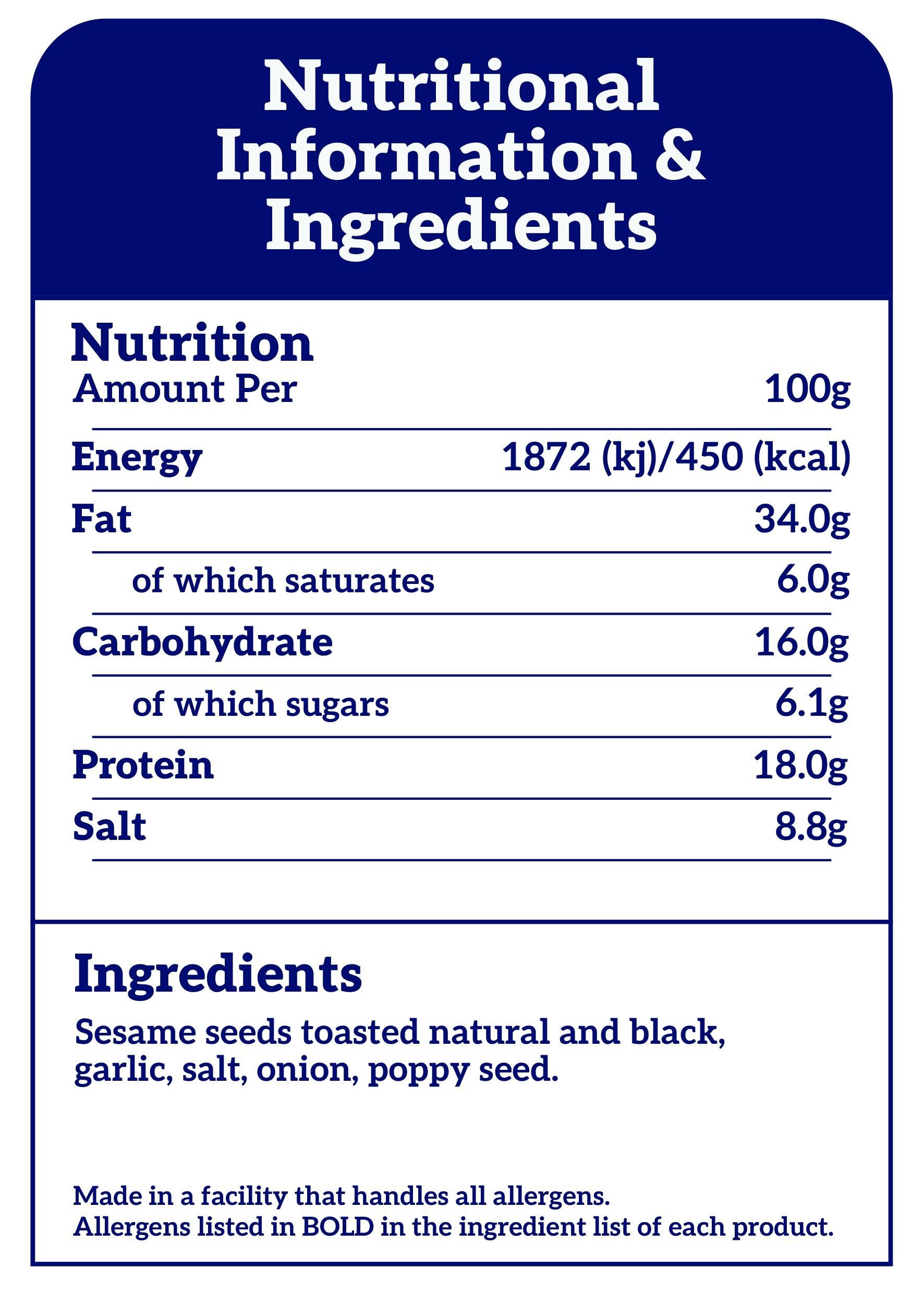 Our Bagelicious New York Deli is a versatile savoury blend of toasted sesame seeds with garlic, onion, salt and blue poppy seeds sourced with care and blended in our own mini-factory in the market town of Bridport in West Dorset. With supreme savouriness and satisfying texture Bagelicious New York Deli adds a new dimension of delicious to - don't get us started - a galaxy of grub, numerous noshes, shedloads of scran. Shake & Appreciate is all we're saying.