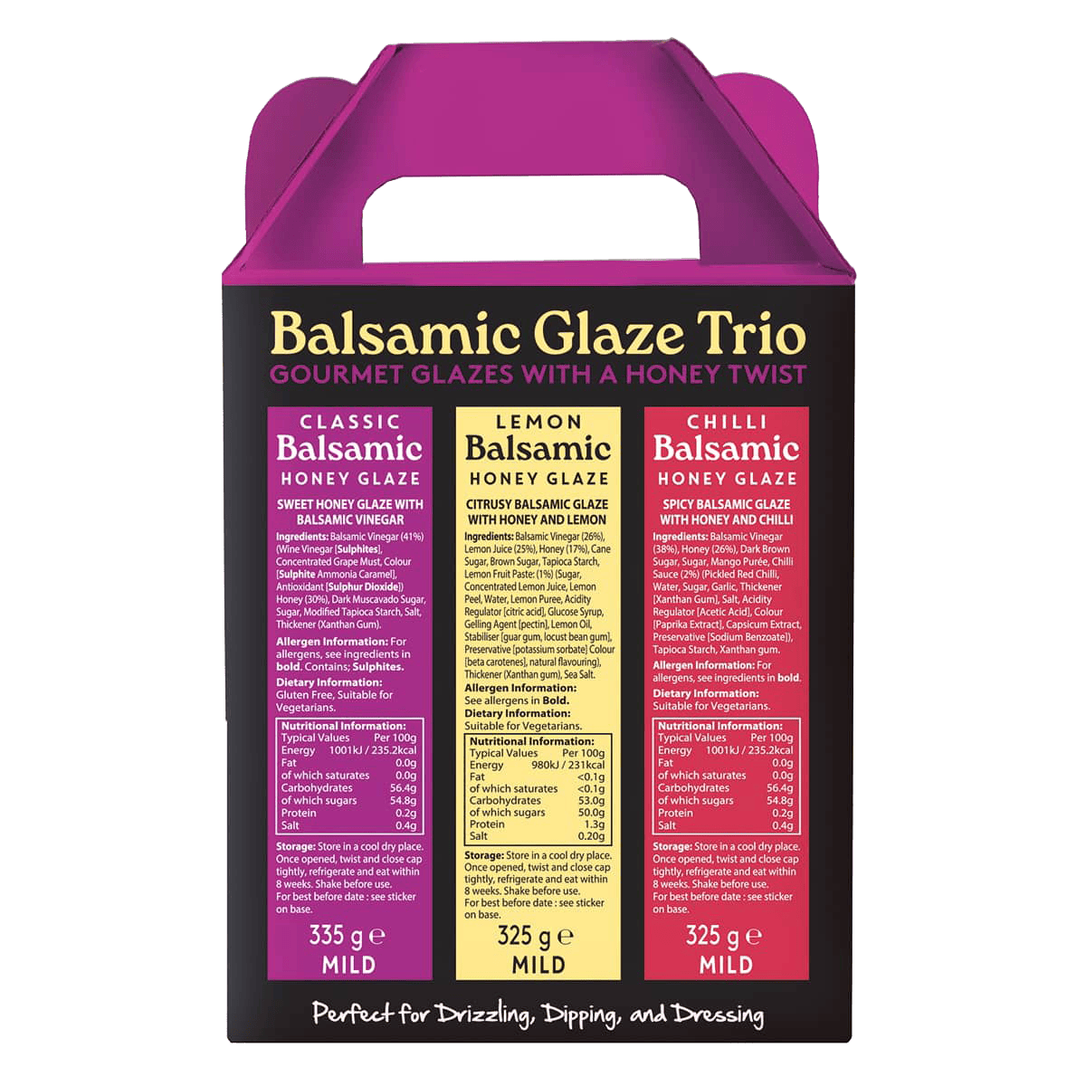Pack Contents: Infused with Pure Honey; the pack includes three different bottles of Gourmet Balsamic Glazes with a honey twist.