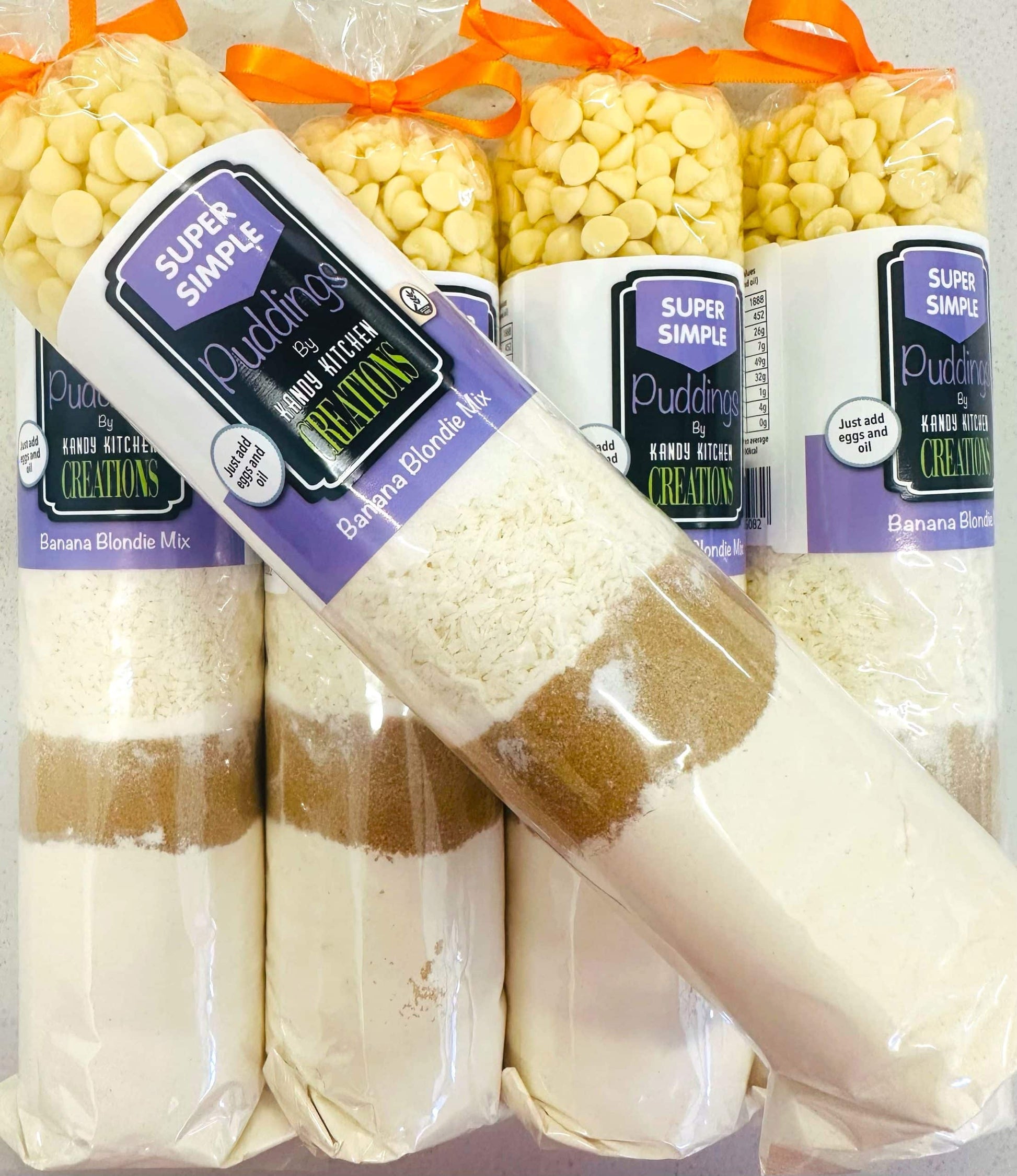 An easy to make, fuss-free blondie traybake mix for a banana flavoured gluten-free cake with coconut and white chocolate chips. Just add eggs and oil.