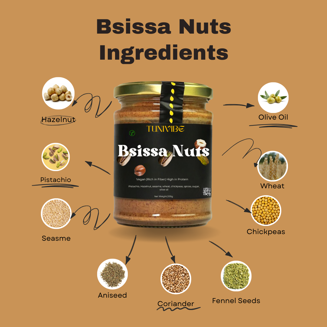 Discover Bsissa Nuts, a wholesome vegan spread crafted from a nourishing mix of roasted cereals, crunchy nuts, and aromatic spices. This energizing superfood delivers a perfect balance of protein, fiber, and healthy fats — making it ideal for clean eating, vegan breakfasts, or guilt-free snacking anytime.