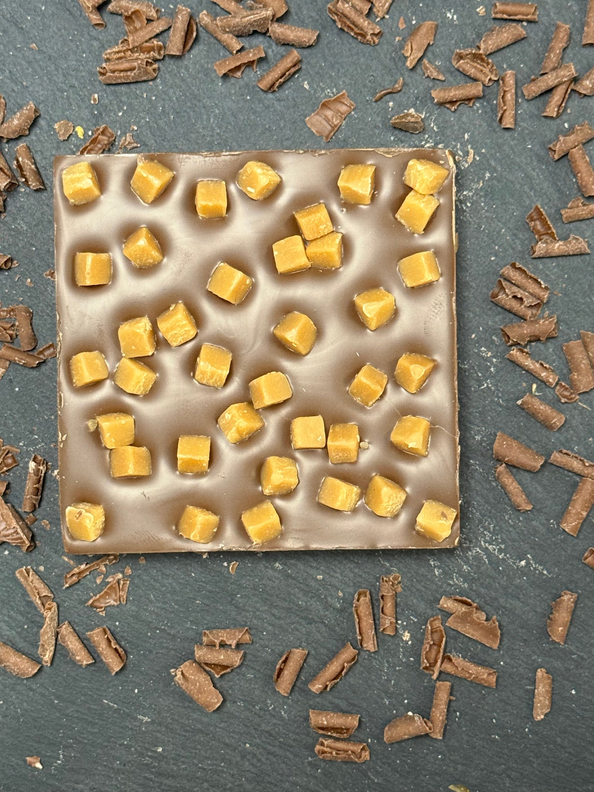 Indulge in bliss with our Caramel Fudge Mini Bloc. Handcrafted with luscious caramel fudge chunks nestled in velvety milk chocolate, each piece delivers a delightful contrast of textures and flavours. Perfect for satisfying sweet cravings or sharing with fellow chocolate lovers. A little luxury that packs a big punch of pure chocolate joy.