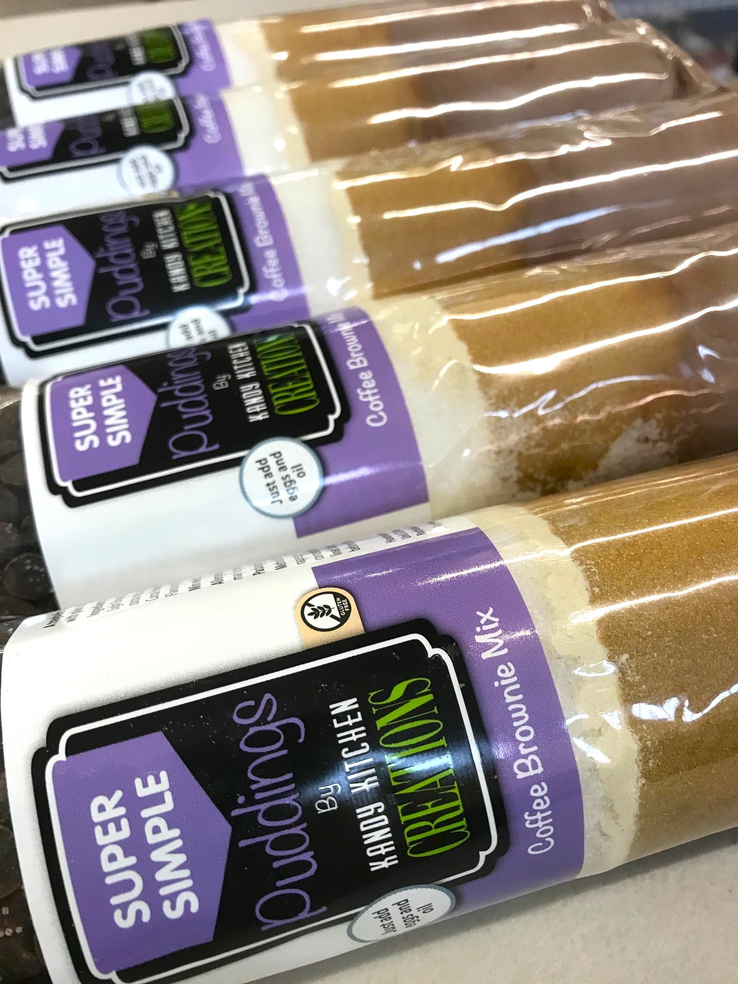 An easy-to-make, fuss-free, traybake mix for a Coffee-flavoured brownie mix topped with dark chocolate chips. Just add eggs and oil.