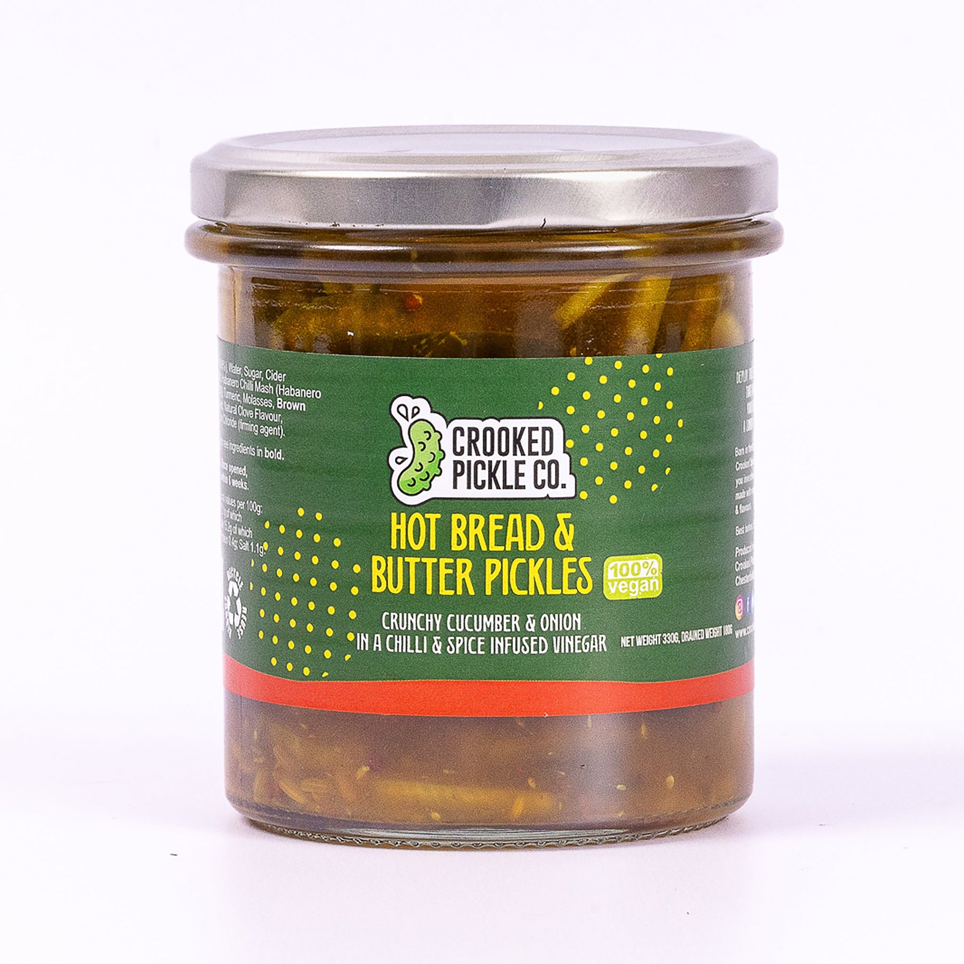 Ingredients: Cucumber, Water, Sugar, Cider Vinegar, Onion, Salt, Habanero Chilli Mash (Habanero Chillies, Salt, Acetic Acid [E260]) Turmeric, Molasses, Brown Mustard Seed, Fennel Seed, Natural Clove Flavour, Coriander Seed, Dill Seed, Calcium Chloride (firming agent).