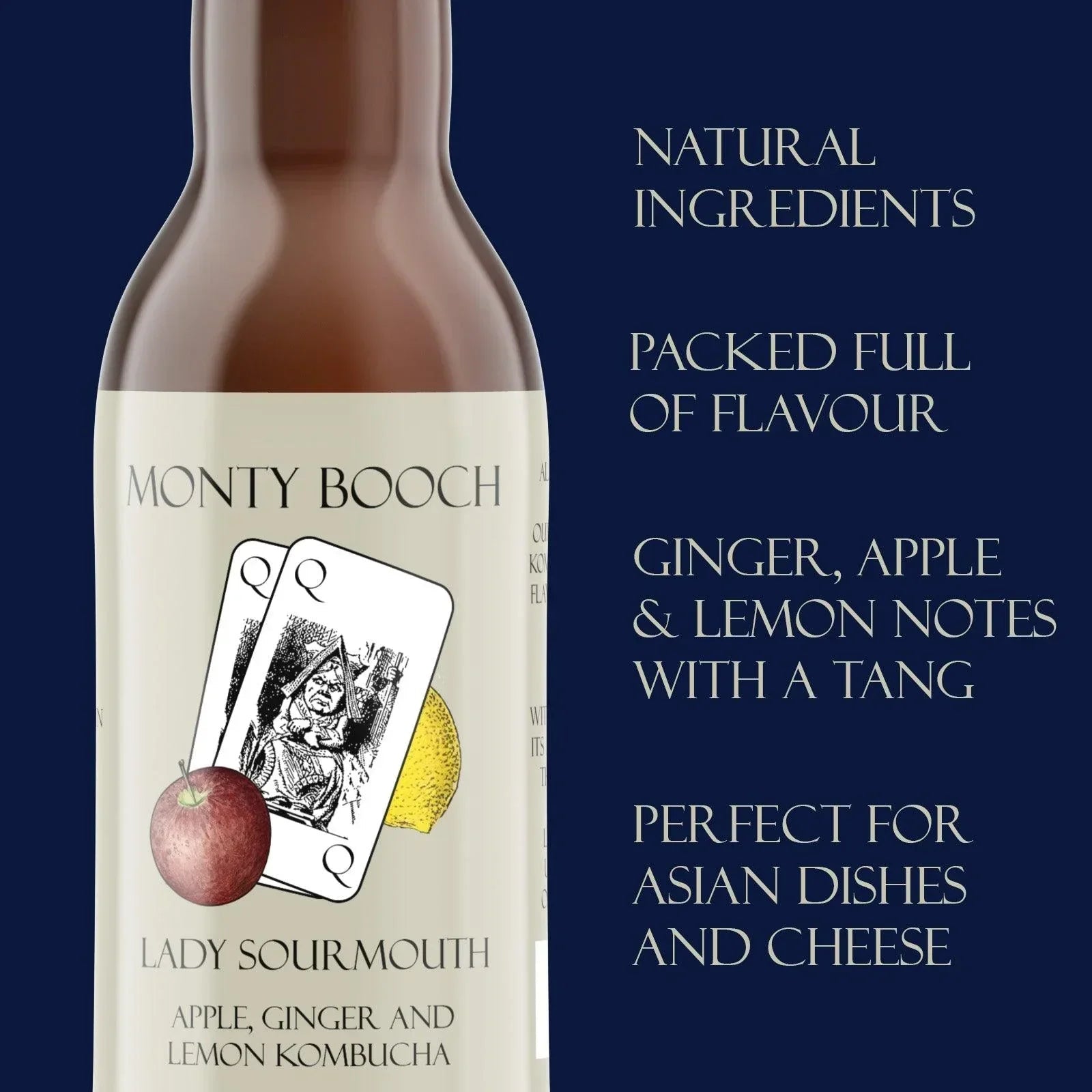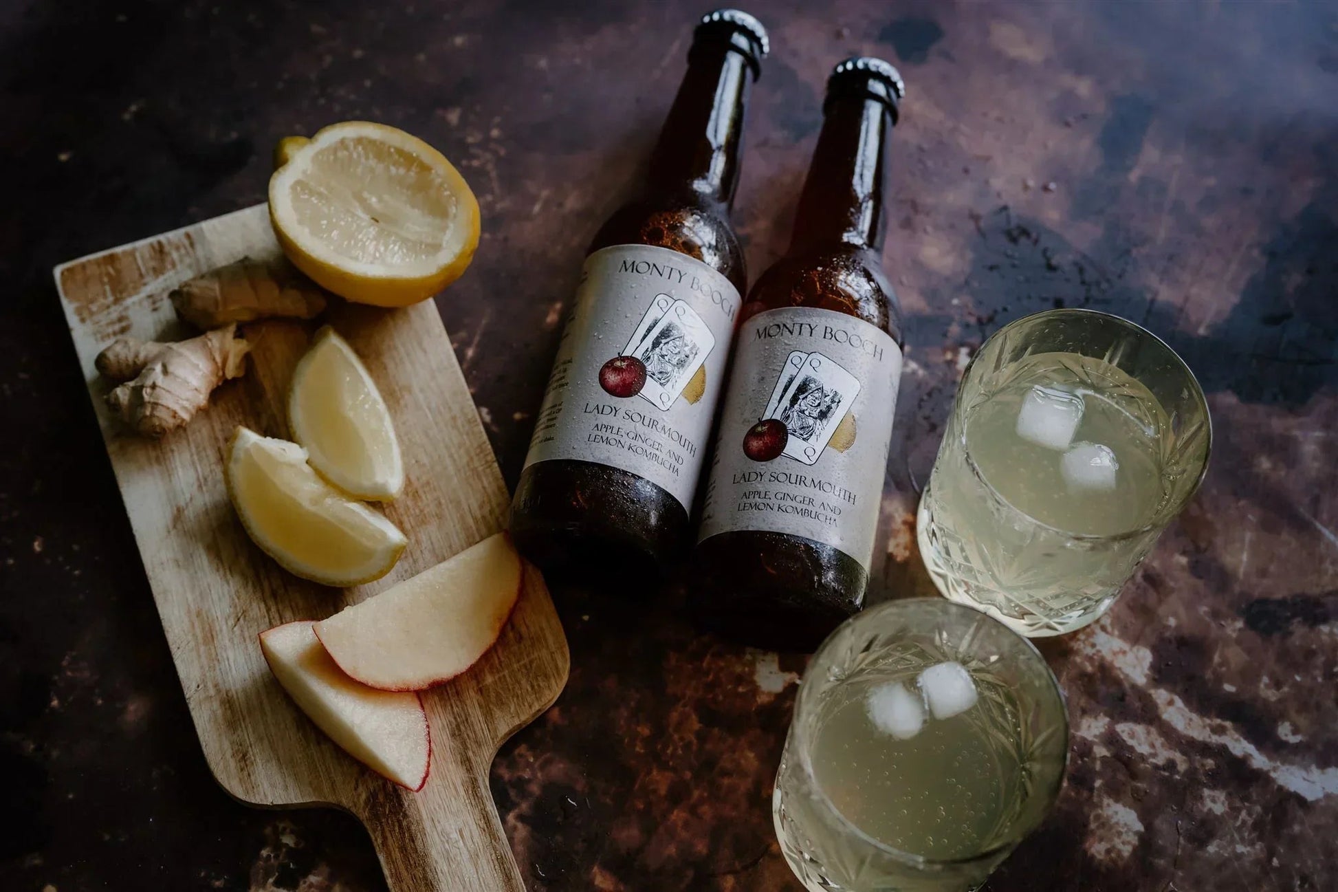 Lady Sourmouth Apple, Lemon & Ginger Kombucha - Our Cider Alternative - It is the ultimate blend of elegance and refreshment. Crafted with a unique combination of apple, ginger and lemon, this premium kombucha offers a bold apple flavour that’s both invigorating and refined, with back notes of Lemon and ginger. Monty Booch is also packed full of probiotics, which is thought to be good for your gut health.