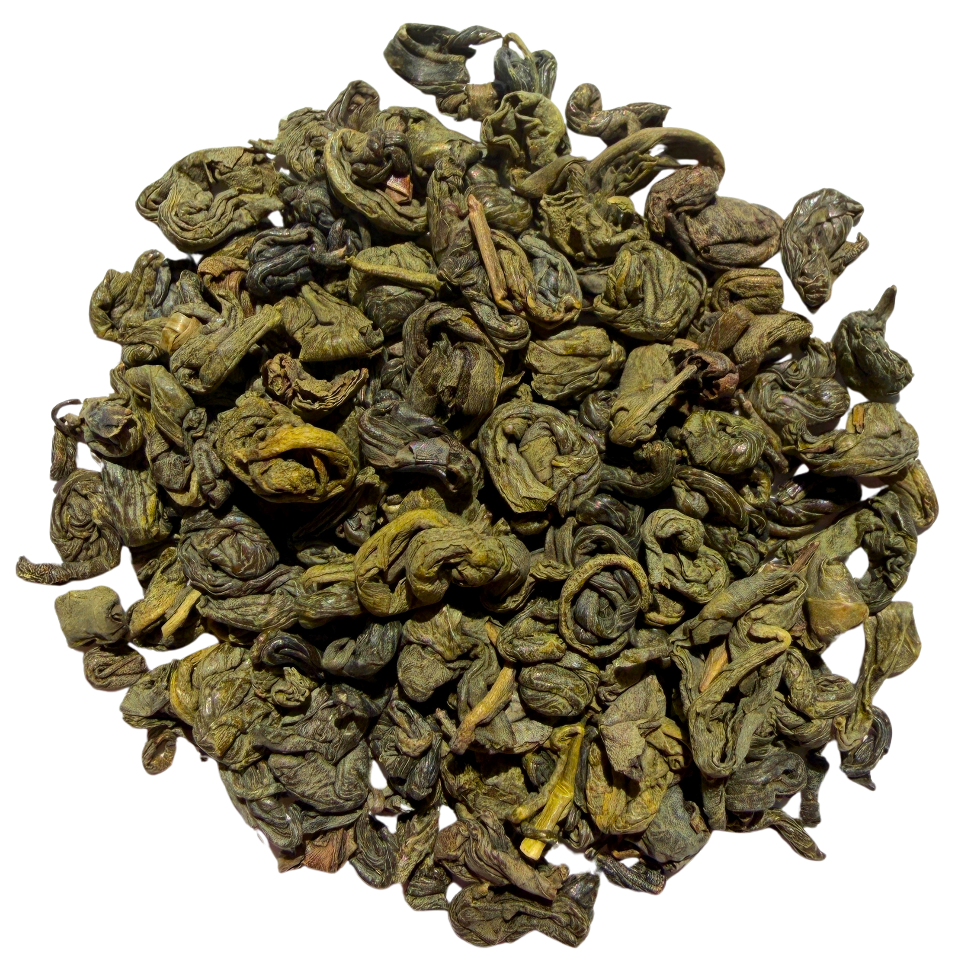 Legend has it that the name Gunpowder was given by a young English clerk who thought the tiny rolled green balls resembled gunpowder. Rolling the leaf has two effects on quality of the tea. It forces flavourful juices that otherwise would remain in the leaf to the surface. Rolling also forces out water, thus helping to reduce the tea's final moisture content. The pellet retains its shape during firing and keeps its freshness longer than other teas outside of the pellet form.