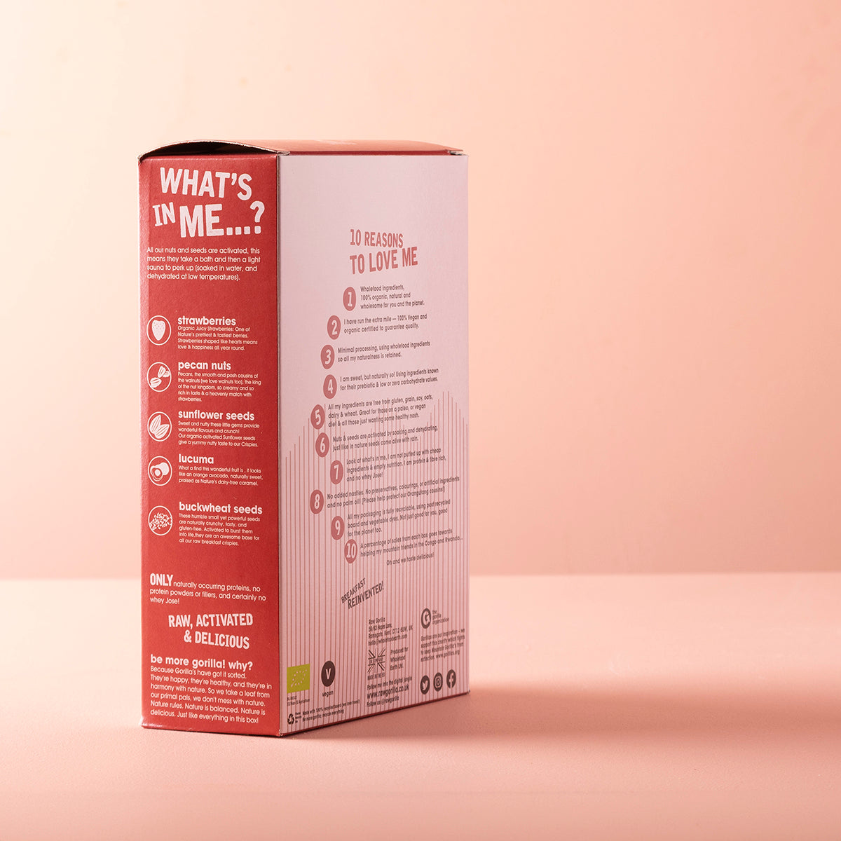 Raw Gorilla Rawberry Crispies are obviously scrumptious as breakfast, but why stop there? They can add a toothsome crunch to your yogurt and fruit lunch! Or if you don't have time to bother with all this m*lk and cereal combining, just eating it from the box makes for a delicious snack, so go ape!
