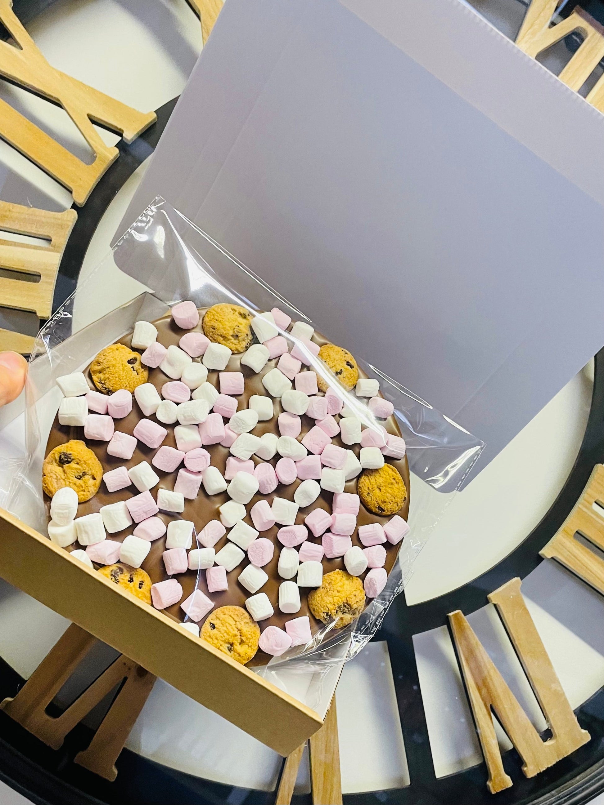 Indulge in a playful twist on a classic treat with our Rocky Road Milk Chocolate Pizza. This 300g disc of creamy milk chocolate is loaded with mini chocolate chip cookies and mini mallows, creating a fun, chewy, and crunchy delight in every bite. Perfect for sharing—or not!