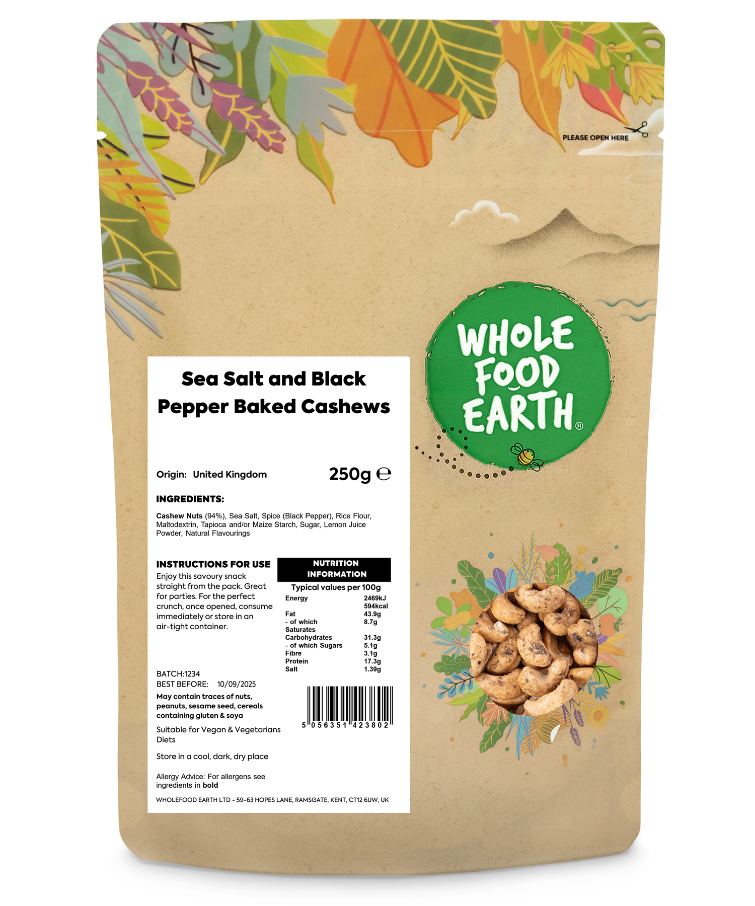 Our Sea Salt and Black Pepper Baked Cashews are deliciously savoury, subtly spicy, crunchy and addictive.