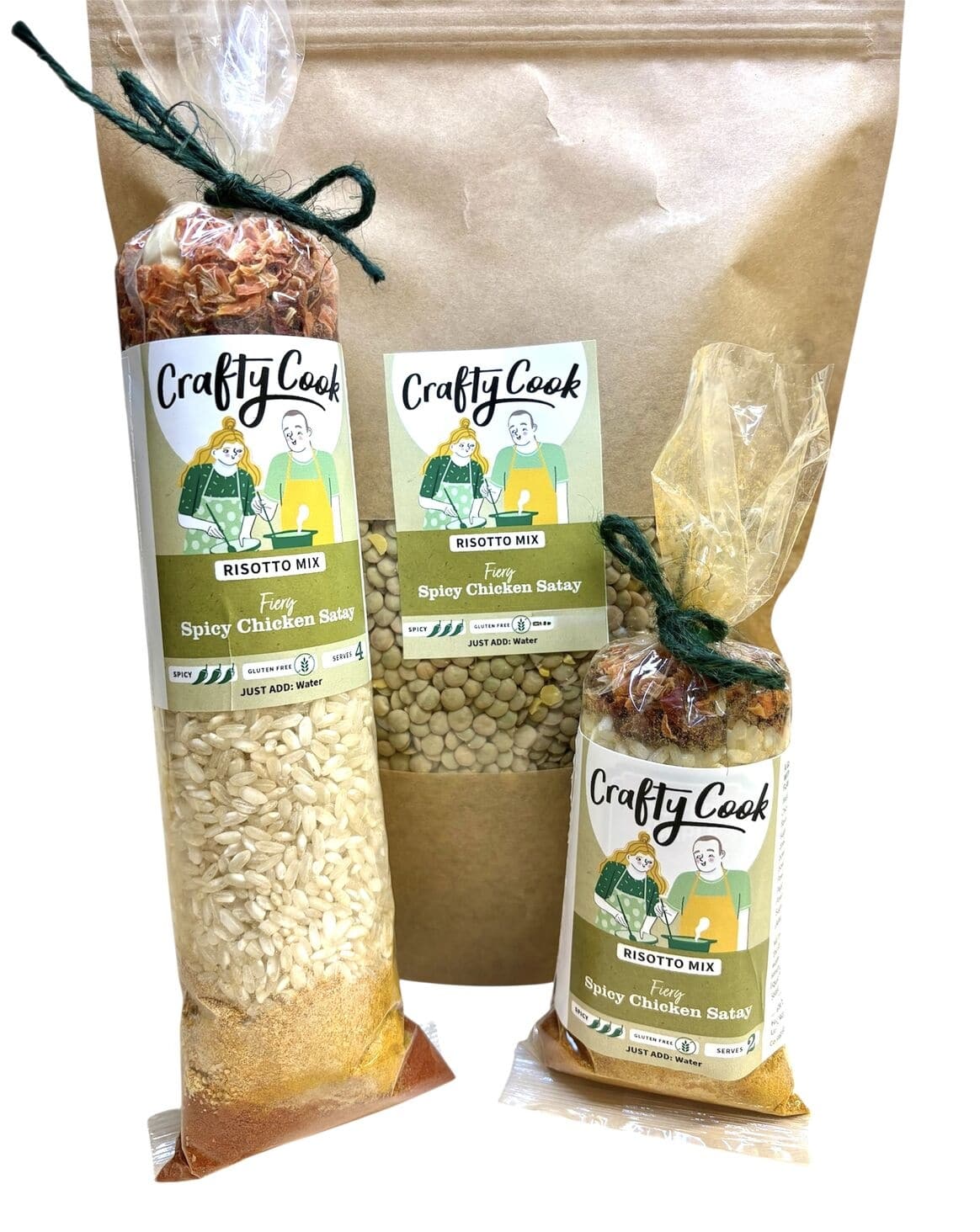 A gluten-free dried risotto rice mix with chicken stock, peanut -free satay flavour seasoning & a spicy chilli heat.