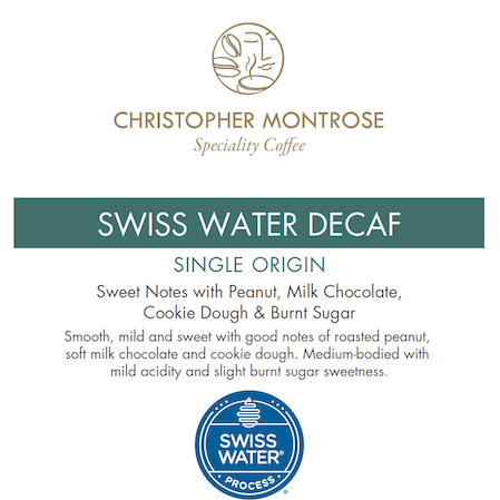 At Christopher Montrose Coffee, we searched long and hard to find possibly the best decaf you will ever have the good fortune to taste. Our Swiss Water Decaf is smooth, mild and sweet with good notes of roasted peanut, soft milk chocolate and cookie dough. Medium-bodied with mild acidity and slight burnt sugar sweetness.