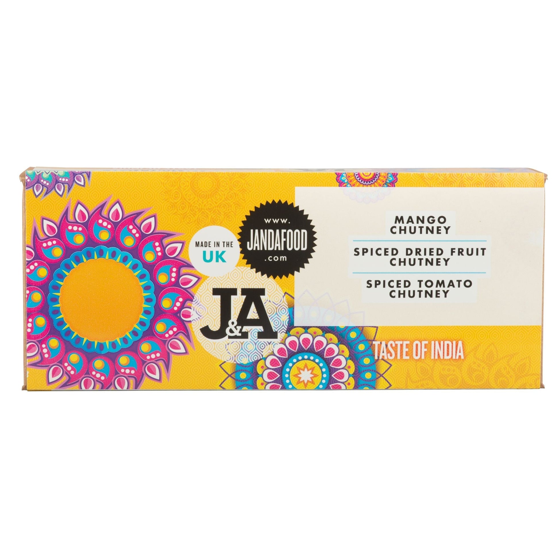 Experience the rich flavours of India with our Taste of India Gift Box: Mango Chutney, Spiced Dried Fruit Chutney, and Spiced Tomato Chutney. Perfect for gifting.