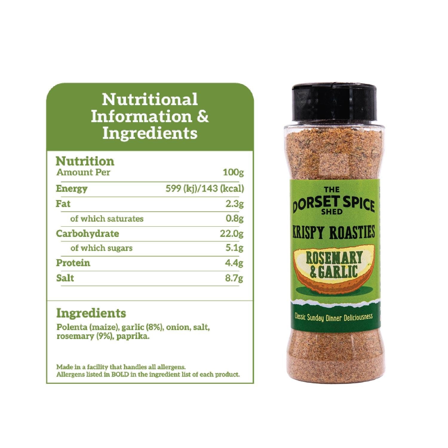 Krispy Roasties Rosemary & Garlic: Polenta (maize(, garlic, onion, salt, rosemary, paprika