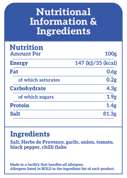 Enjoy the Mediterranean Diet to the full with each savoury mouthful. Our Everyday Umami can help reduce the amount of salt you use thanks to its flavour-boosting ingredients especially time-honoured Herbes de Provence, garlic, onion, black pepper and a hint of flavour-boosting chilli.
