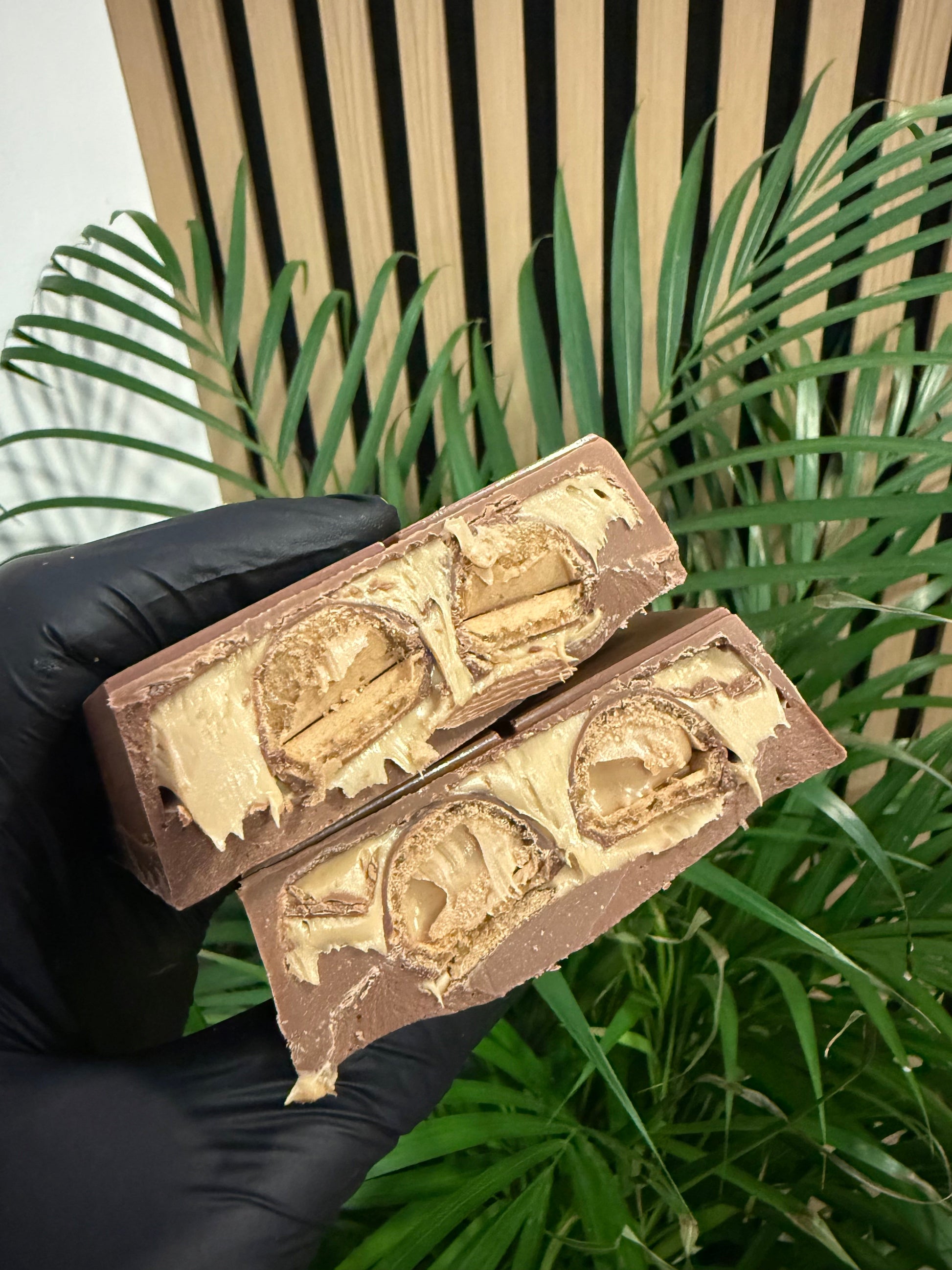 The Kinderella Bar is a thick and chunky delight featuring our signature milk chocolate layered with a creamy white chocolate hazelnut creme and a crispy chocolate hazelnut wafer filling.