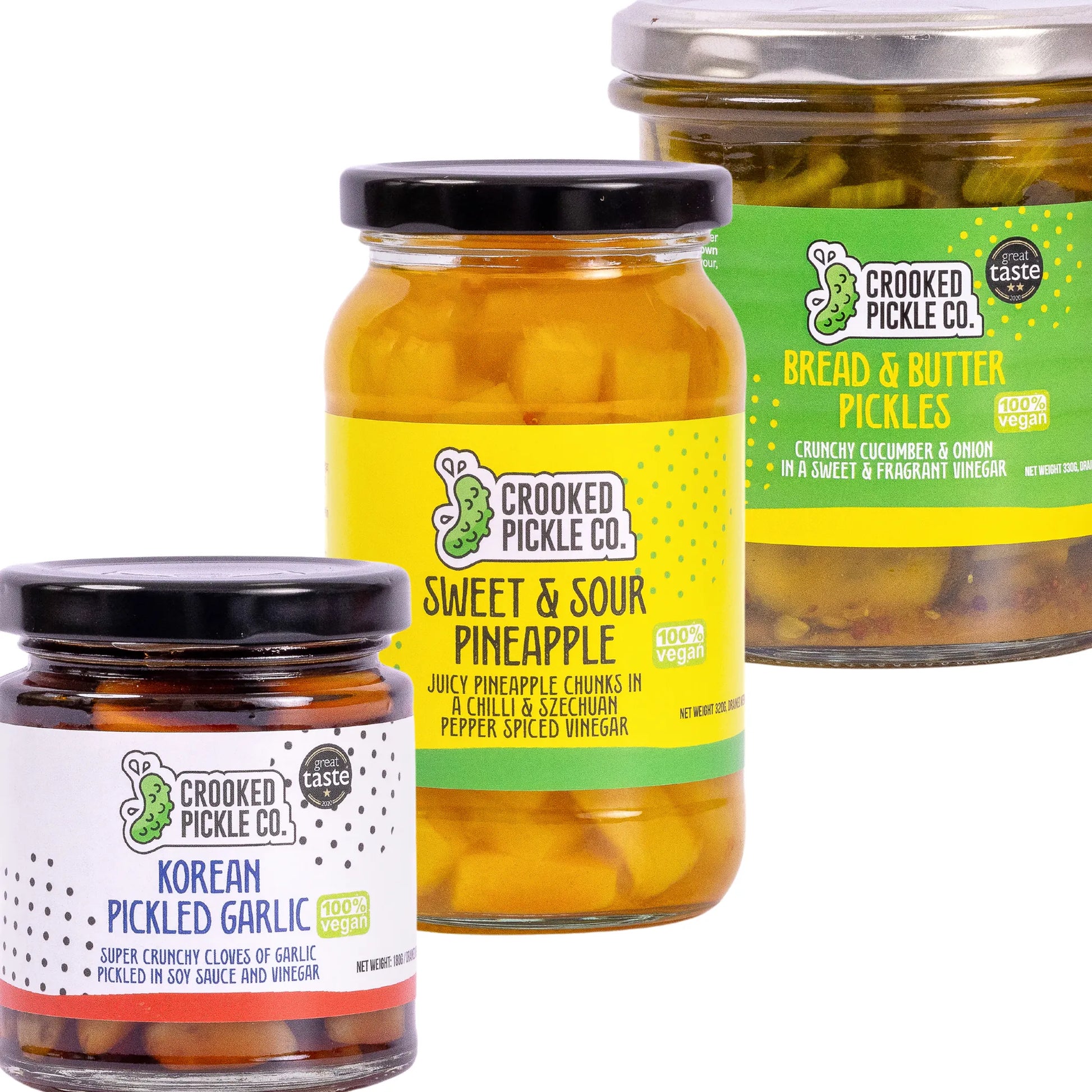 This unique bundle brings together three pickles from our original line-up that have stood the test of time: Bread & Butter Pickles, Sweet & Sour Pineapple, and Korean Pickled Garlic. Perfect for food enthusiasts and adventurous eaters, this trio offers a delightful variety of tastes and textures and an exploration of the essence of Crooked Pickle Co. products.