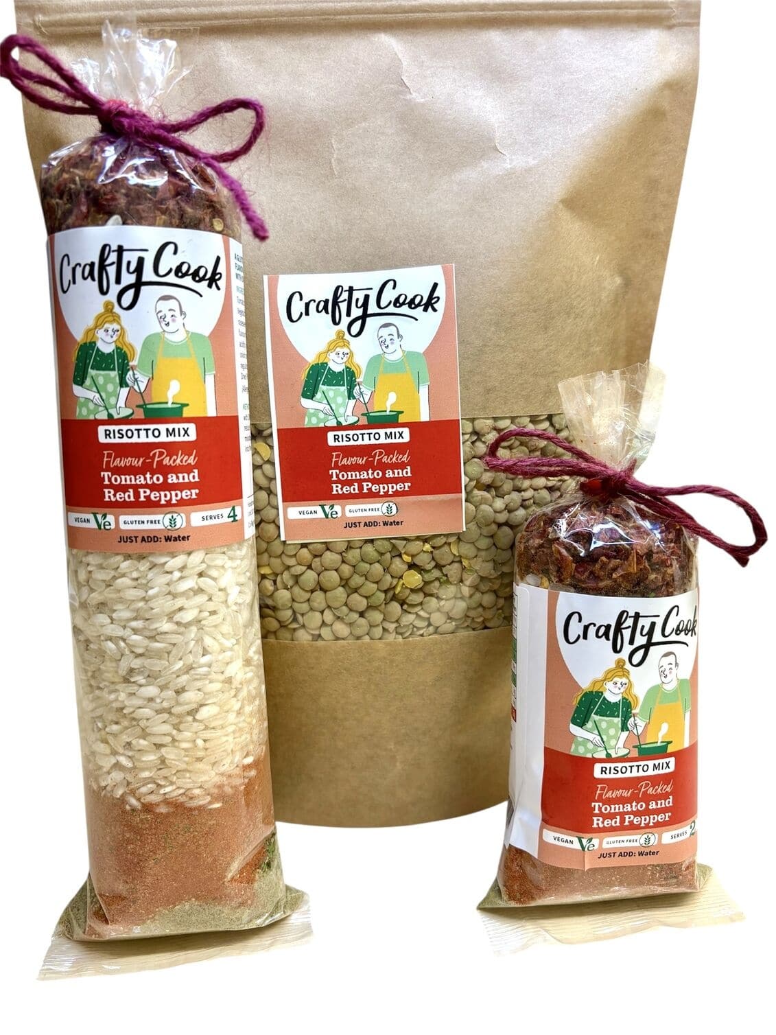 A gluten-free, vegan tomato flavoured dried risotto rice mix with dried red pepper.